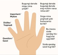 Uchinchi barmoq – tahlil. O‘qituvchi o‘quv jarayonini tahlil qiladilar, kelajakda qanday usul va texnologiyalar ishlashini tushunishga harakat qiladilar.