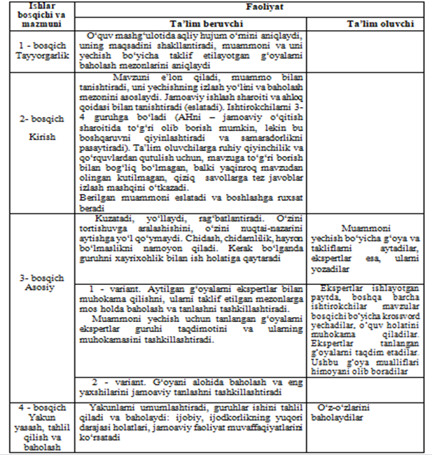 Aqliy hujum usuli qo‘llanilgan o‘quv mashg‘ulotining texnologik xaritasi